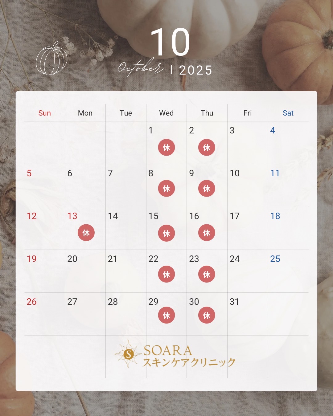 10月診療日程 2025.09.19 ご予約はLINE予約またはウェブ予約からお問い合わせください。当日のご予約はお電話にてお問い合わせください0267-68-1212 ボツリヌストキシン注射料金秋の美容キャンペーン 開催のお知らせ